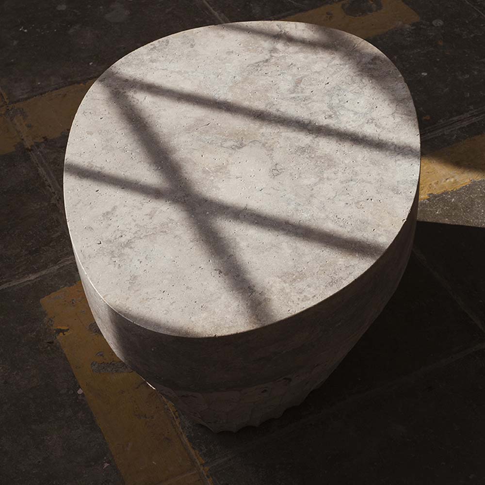 The contrast between porous textures and smooth dark red underlines the studios contemporary approach on traditional materials and craft. The connecting components between the sculptural stone elements and the aluminium parts originate from an intensive research of linking unique handmade shapes with industrial parts.