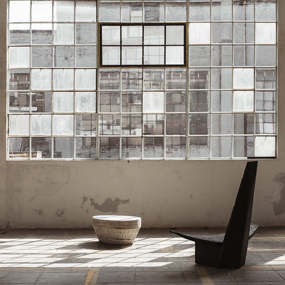 The new series of light sculptures named Ambra combines volumes of ancient stones and aluminium. Centerpiece is the Mexican “Toba volcánica” stone that consists of minerals, glass and volcanic debris ejected one million years ago during severe eruptions. Fragments in the geometrical surfaces are testament to these explosions and movement.