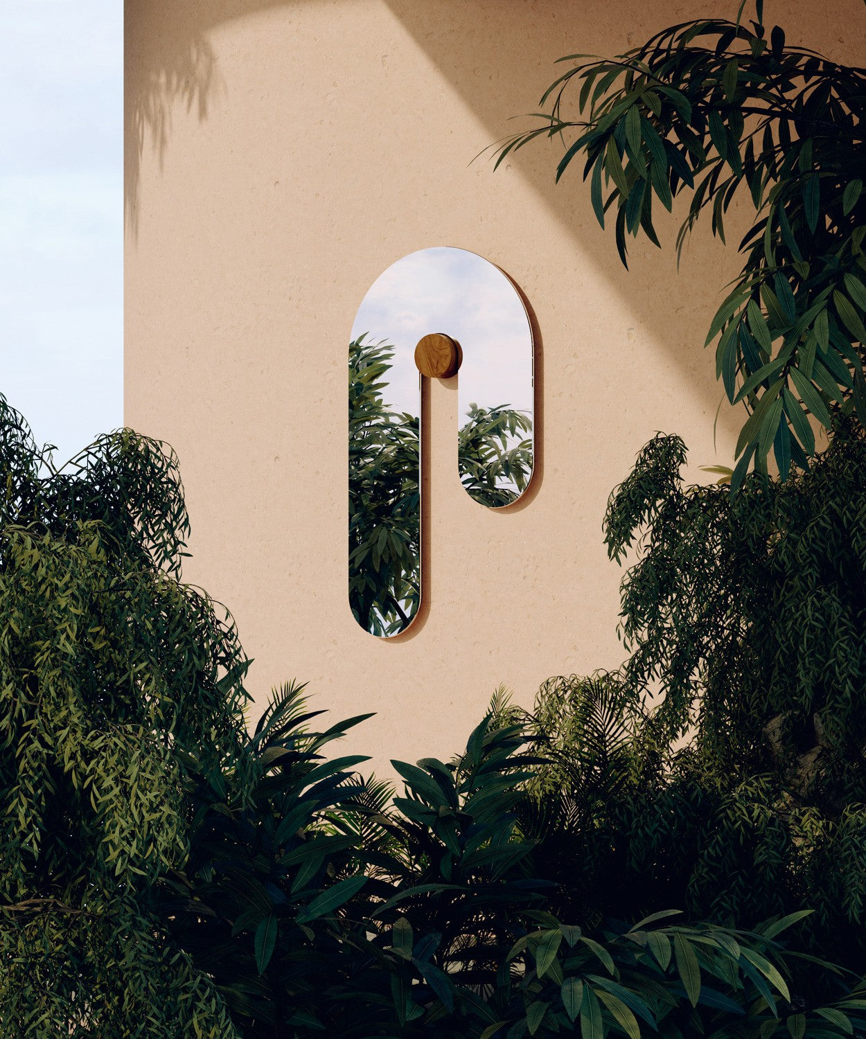 A glass mirror gracefully rests on a solid wooden dowel, like a leaf resting on a branch.