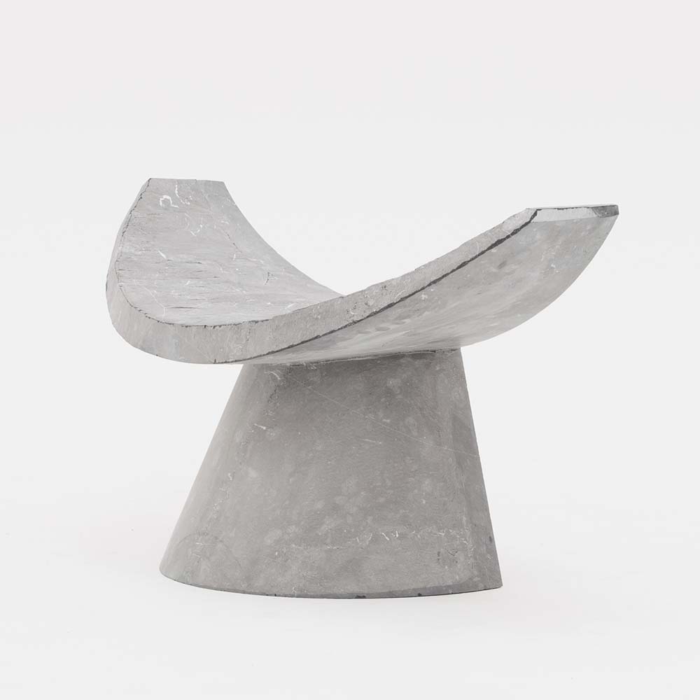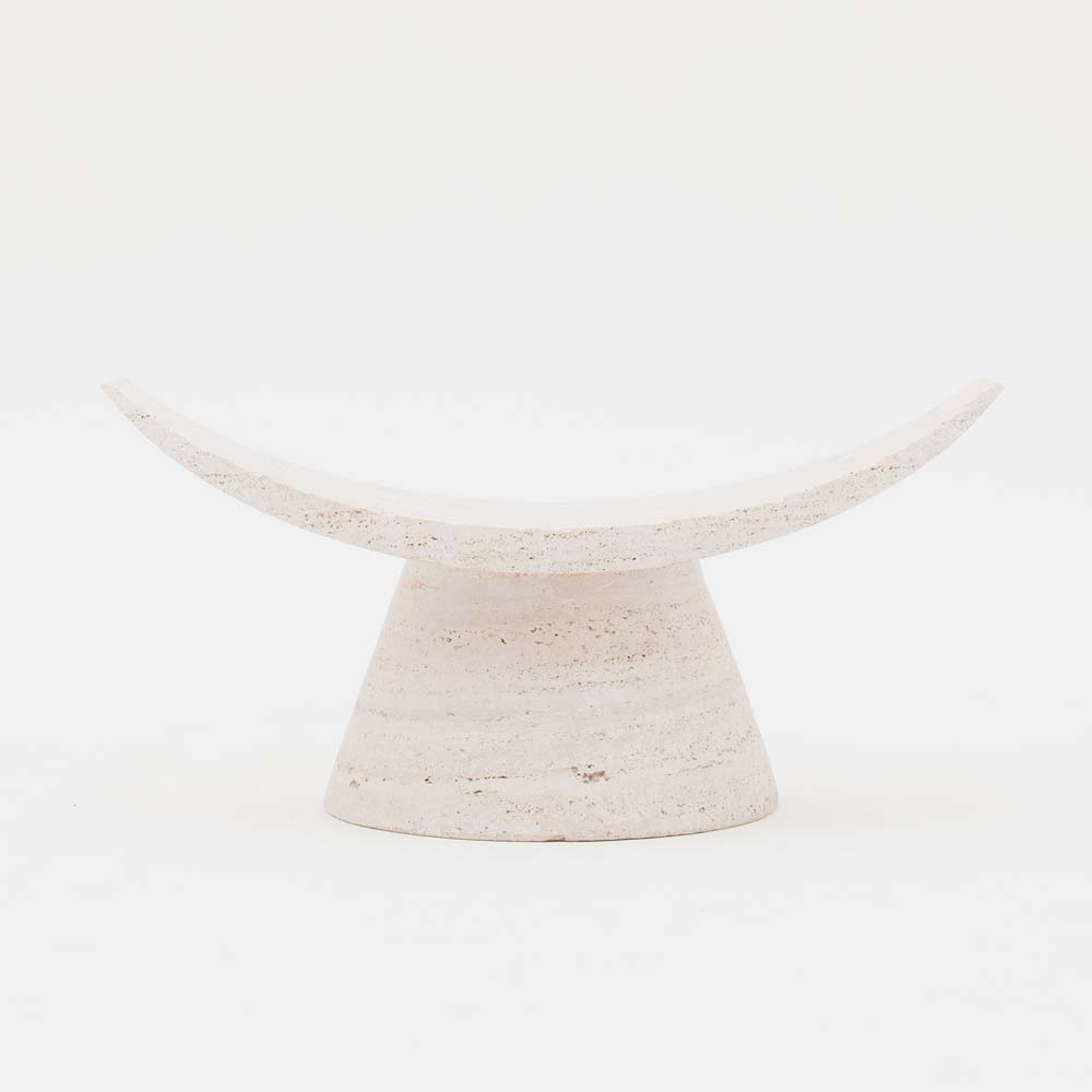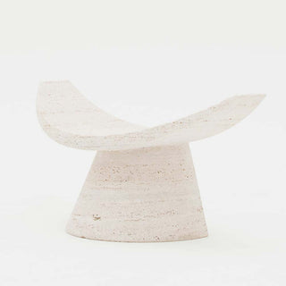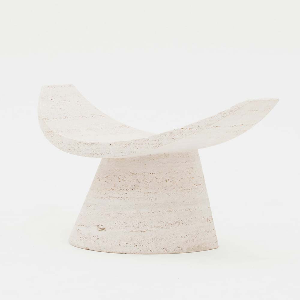 Les tabourets EWE Studio sont fabriqués en bois de chêne, travertin Jalapa et marbre Monterrey . La forme du tabouret devient une expression des techniques sculptées à la main et de ses matériaux. Il combine une base circulaire immaculée avec une surface intérieure rugueuse et un large plateau tribal incurvé .