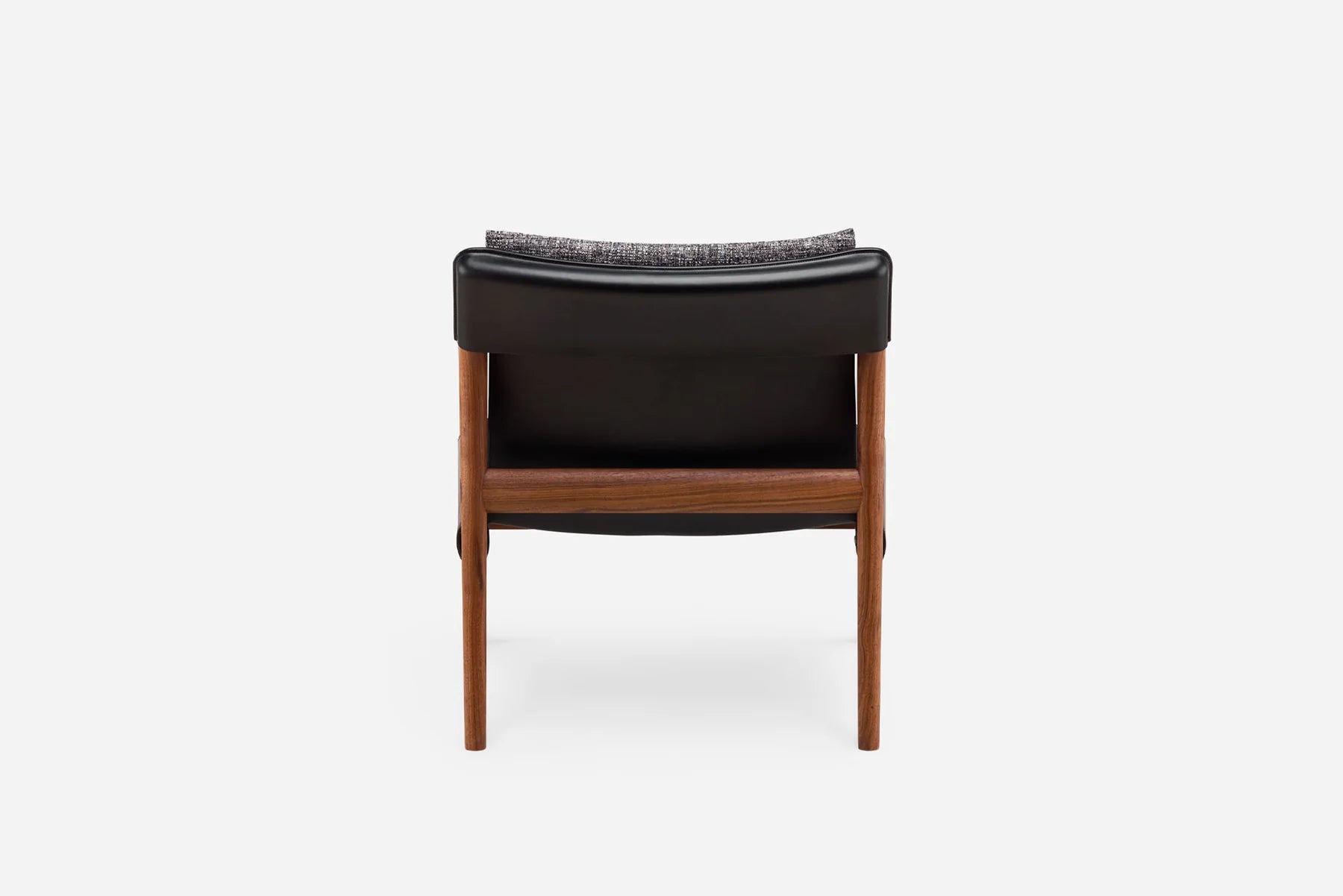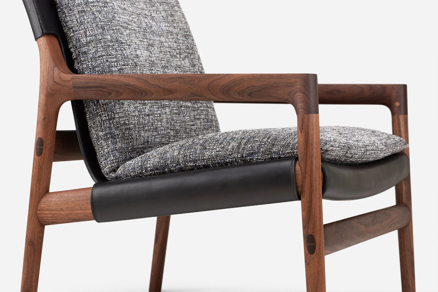 Sela lounge chair, designed by Luca Nichetto, reflects a passion for woodworking, with a tactile timber form with beautiful joinery. An exquisite leather seat, custom made by a Portuguese saddler, is suspended from the chair frame, then softened with upholstered cushions. Sela boasts an ageless appearance with a contemporary edge; the perfect blend of natural elements, craftsmanship, and timeless appeal.
