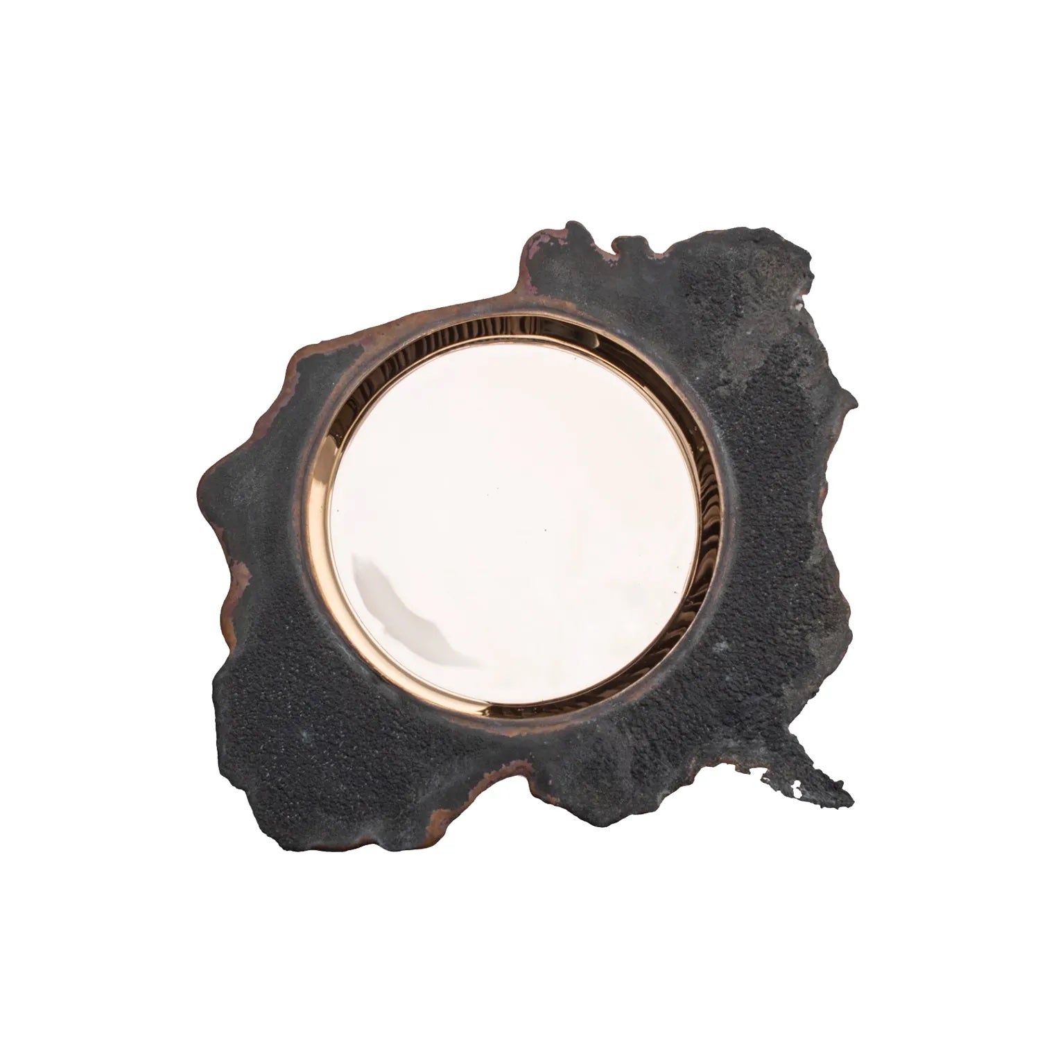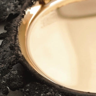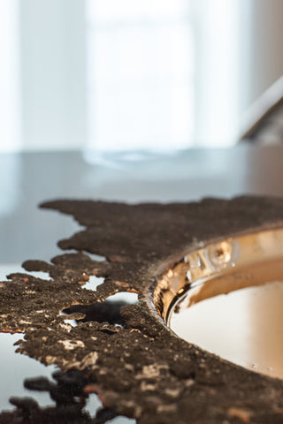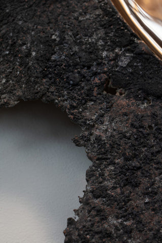 "19.2" is an exploration of the sand casting technique, embracing a generous and spontaneous overspill effect at the edge of each piece, resulting in a completely one-of-a-kind iteration. The immediate oxidation of this overspill creates a highly textured surface, providing a striking contrast to the meticulously hand-polished, nearly mirror-finished interior of the piece.