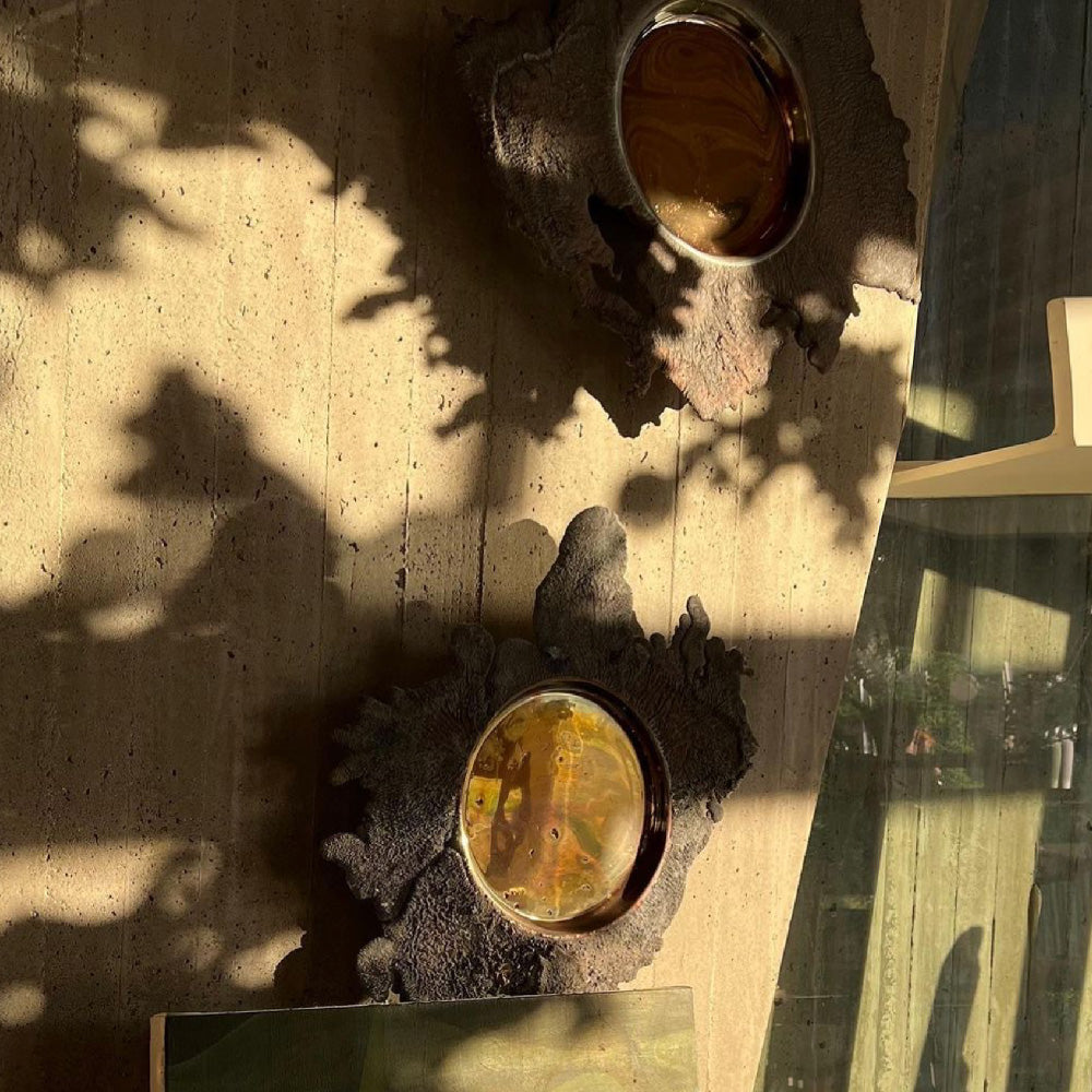 The new series of light sculptures named Ambra combines volumes of ancient stones and aluminium. Centerpiece is the Mexican “Toba volcánica” stone that consists of minerals, glass and volcanic debris ejected one million years ago during severe eruptions. Fragments in the geometrical surfaces are testament to these explosions and movement.
