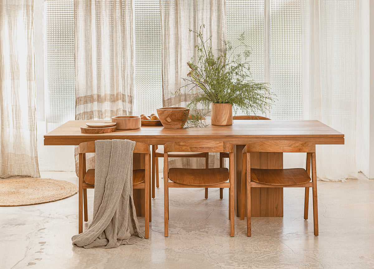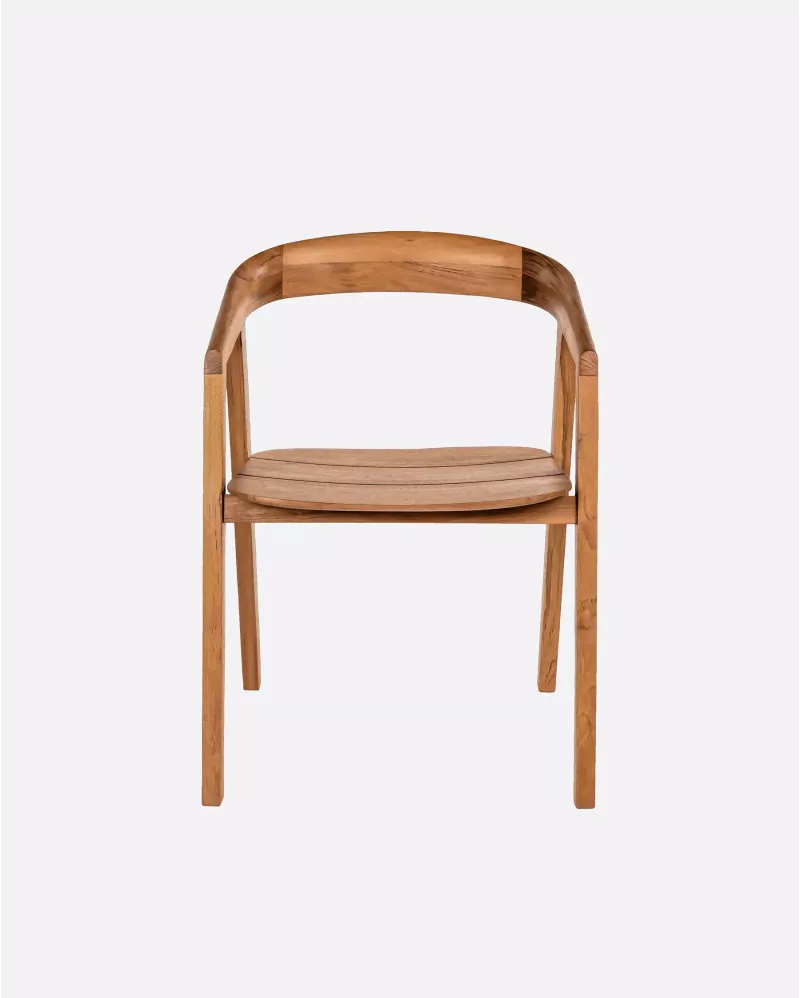 Each chair is crafted from sustainable teak, chosen for its nobility and longevity. Its delicately curved backrest is created from three pieces of solid wood, patiently hand-carved to form a single, fluid, almost organic movement, like a curve traced by the wind.