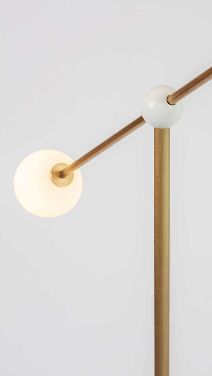 What a beautiful look this elegant and proud floor lamp has with its tapered and rounded base in black marble, its brushed brass pole connected to a central ball joint in powder-coated metal and its inclined pole with two light sources at each end; one in the form of a frosted glass globe, the other a semi-circular brushed brass lampshade.