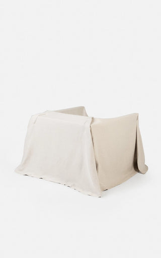 "Capa Lounge chair" is a reinterpretation of the traditional lino silla capa. The shape suggests that a screen has been placed carelessly on the chair. The chair cape is made of off-white linen.