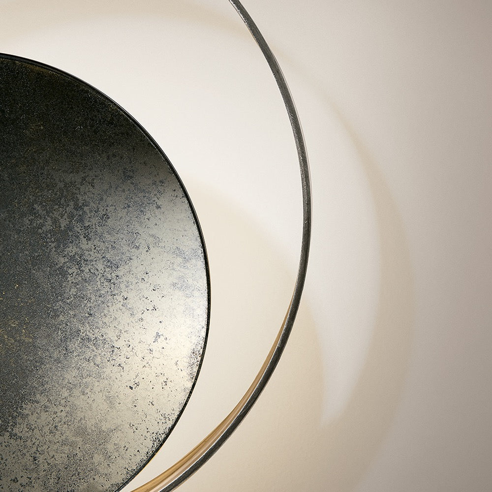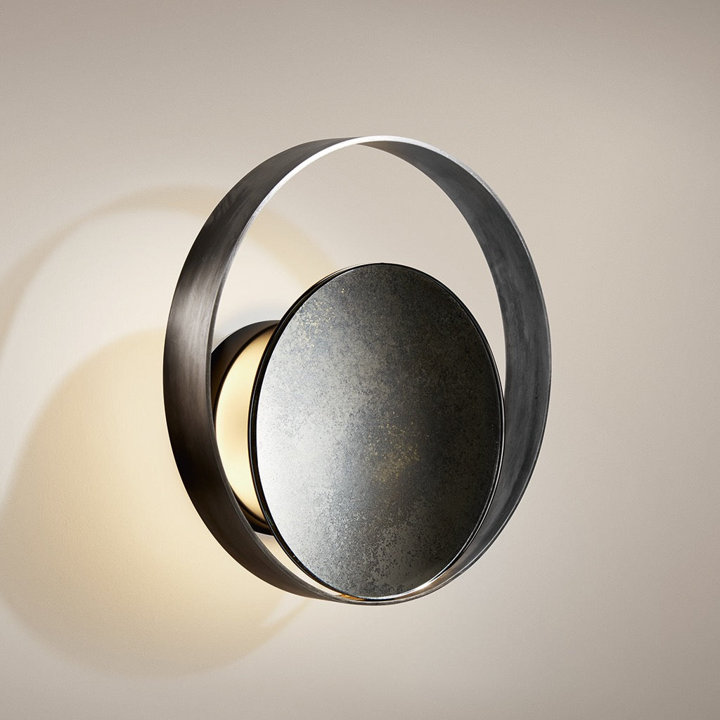 Circle Wall is inspired by a lunar eclipse. The lamp features a matte black nickel disc surrounded by a light burnished brass ring. Like an eclipse, the light source strikes these two elements, redirecting the light and generating shadows and reflections that blend and harmonize beautifully. Also available in a ceiling version.