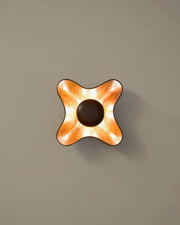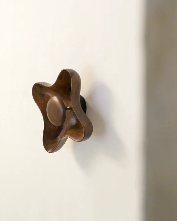 The flower-shaped wall light made of teak wood, sober and harmonious, diffuses an ingenuous and intimate light. Available in several colors.
