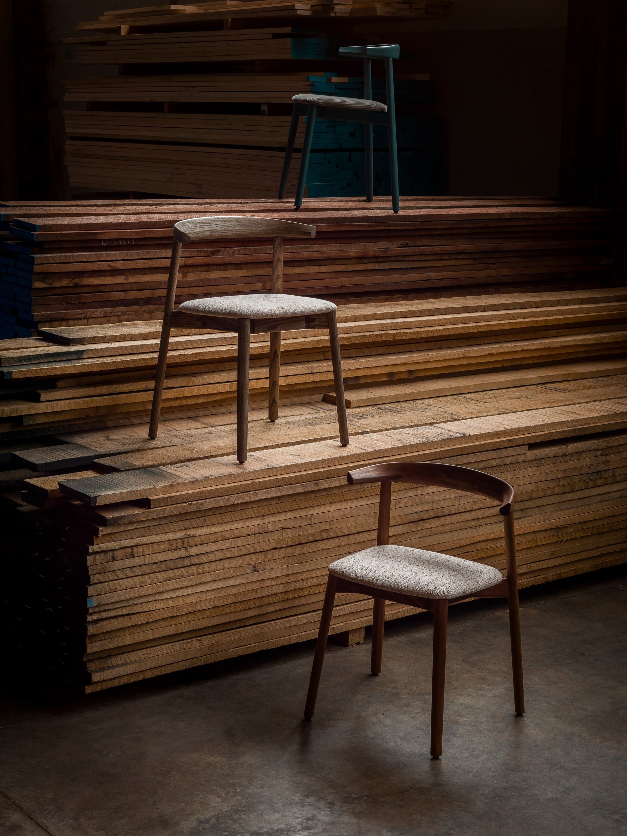 Upholstered Ando Chair is a utilitarian, robust and quiet design with beautiful detailing. It is a relatively compact dining chair with strength and personality whilst remaining understated. The back is made from multiple pieces of wood, joined and carved, showcasing the natural grain variations in the material. The seat is softened by upholstery for added comfort.