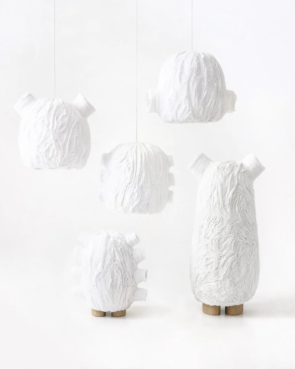 Materials : Metal frame, fluffy and breathable ecological fabric called "muslin". Upcycled steel frame and live ZTISTA material - a blend of cellulose, clay, flax fiber, wood chips, biopolymer cover.