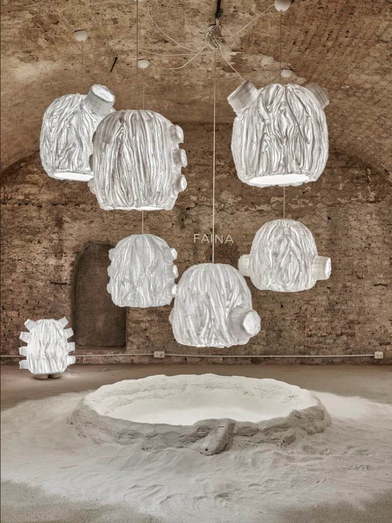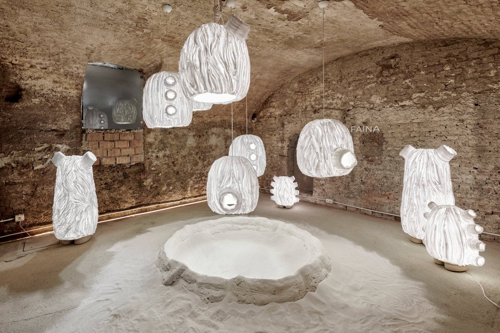 The new series of light sculptures named Ambra combines volumes of ancient stones and aluminium. Centerpiece is the Mexican “Toba volcánica” stone that consists of minerals, glass and volcanic debris ejected one million years ago during severe eruptions. Fragments in the geometrical surfaces are testament to these explosions and movement.