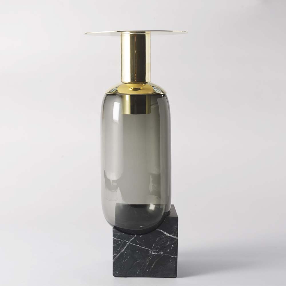 Elements is an enigmatic vase made of precious materials such as blown glass, marble and brass. It is as well a ceremonial by the soft music played by the brass top when in contact with the glass part.