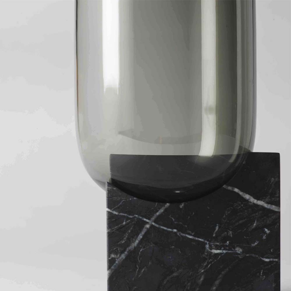 This piece is the encounter of materials such as the powerful marble base which welcomes as a nest the glass part. An eminent ornamental piece that assumes its part of mystery.