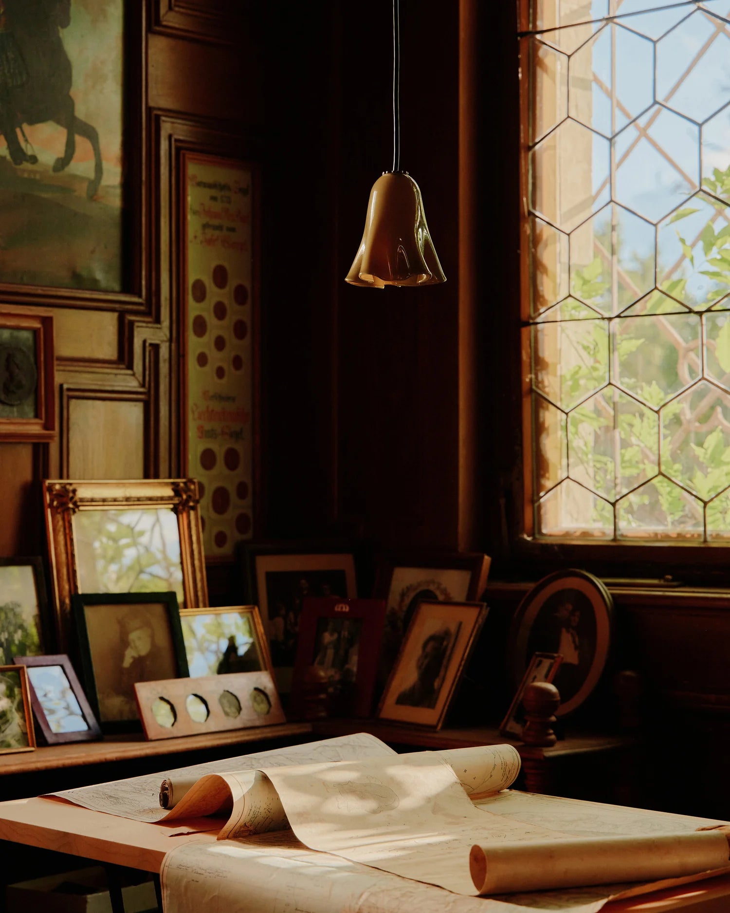 Fazzo Petite transposes the elegance of the Fazzo pendant into a format designed to enhance more intimate spaces. Its shade, crafted using the centuries-old fazzoletto technique—where molten glass twists to form delicate ripples similar to faded petals—creates a graceful, flowing silhouette. Adorned with hand-patinated brass details and illuminated by a dimmable bulb, this creation diffuses a soft, adjustable light, like a suspended breath of poetry.