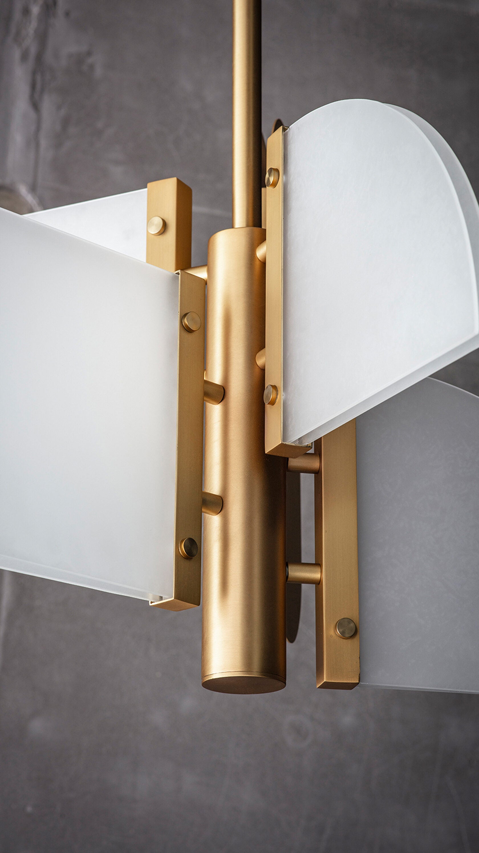 A splendid suspended light composed of frosted glass sheets inserted into brushed brass metal channels with a light strip in between. Pure voluptuousness.