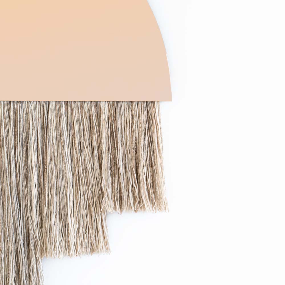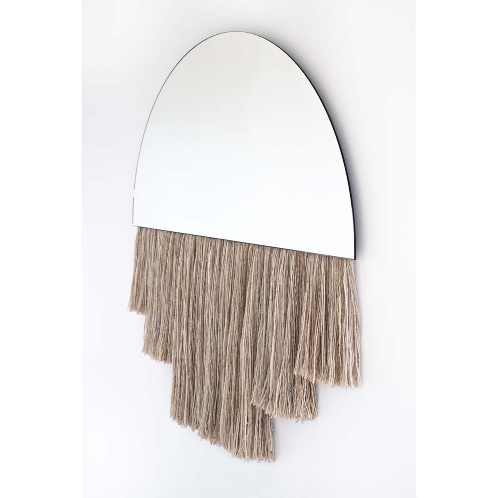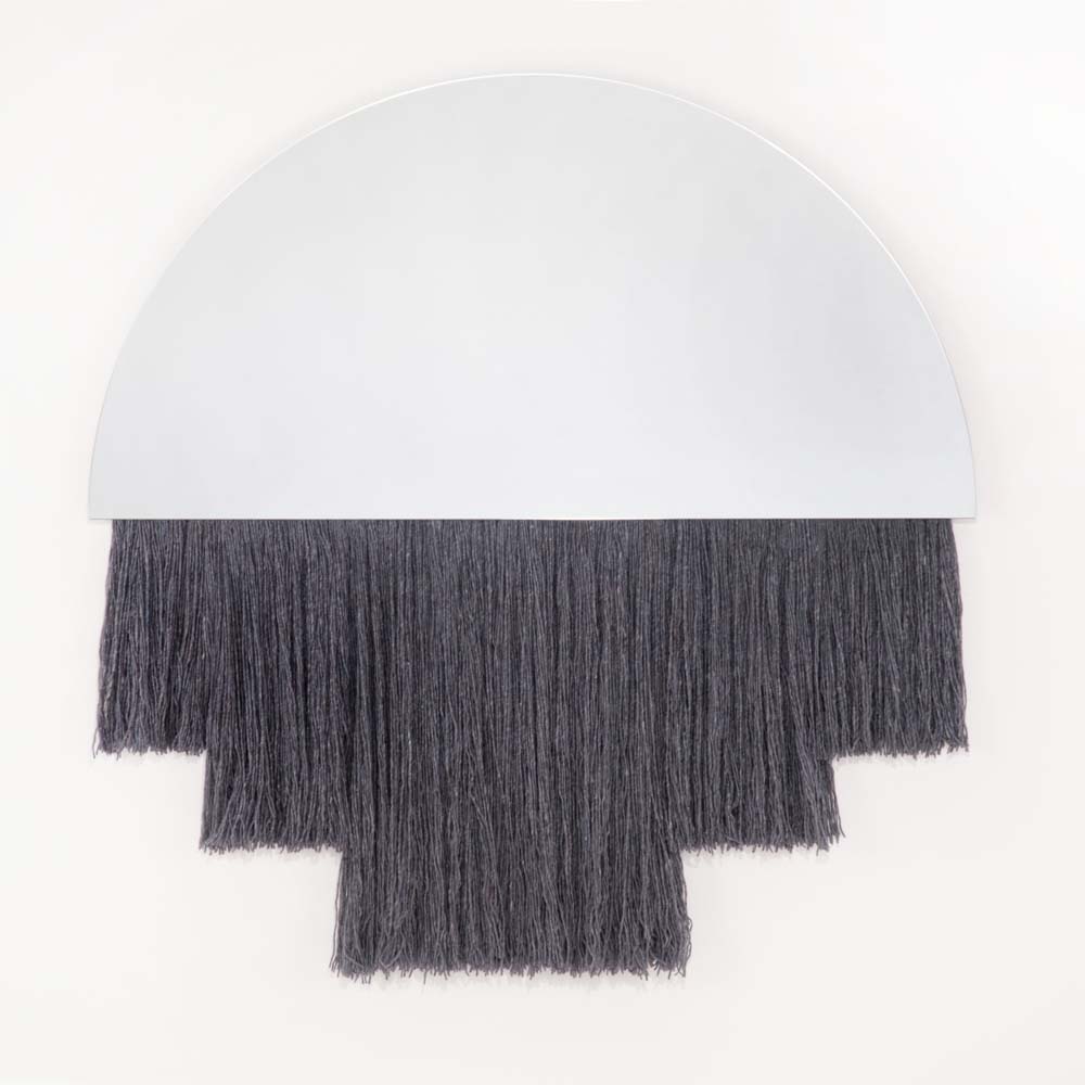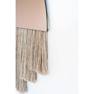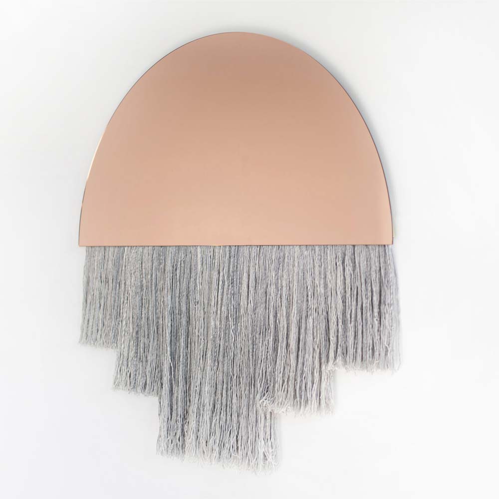 A large-scale mirror reminiscent of a half moon partnered with hand-spun, hand-painted silk fiber. Shown here in clear and peach mirror with natural and dark grey fiber. This version of Ben & Aja Blanc mirror collection is available in different colors of mirror and fiber to let you personalize your one-of-a-kind object.
