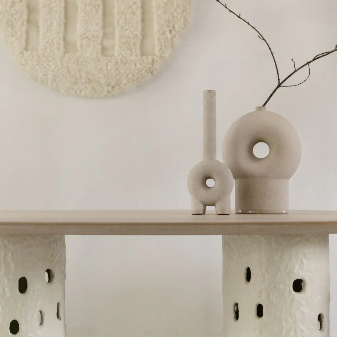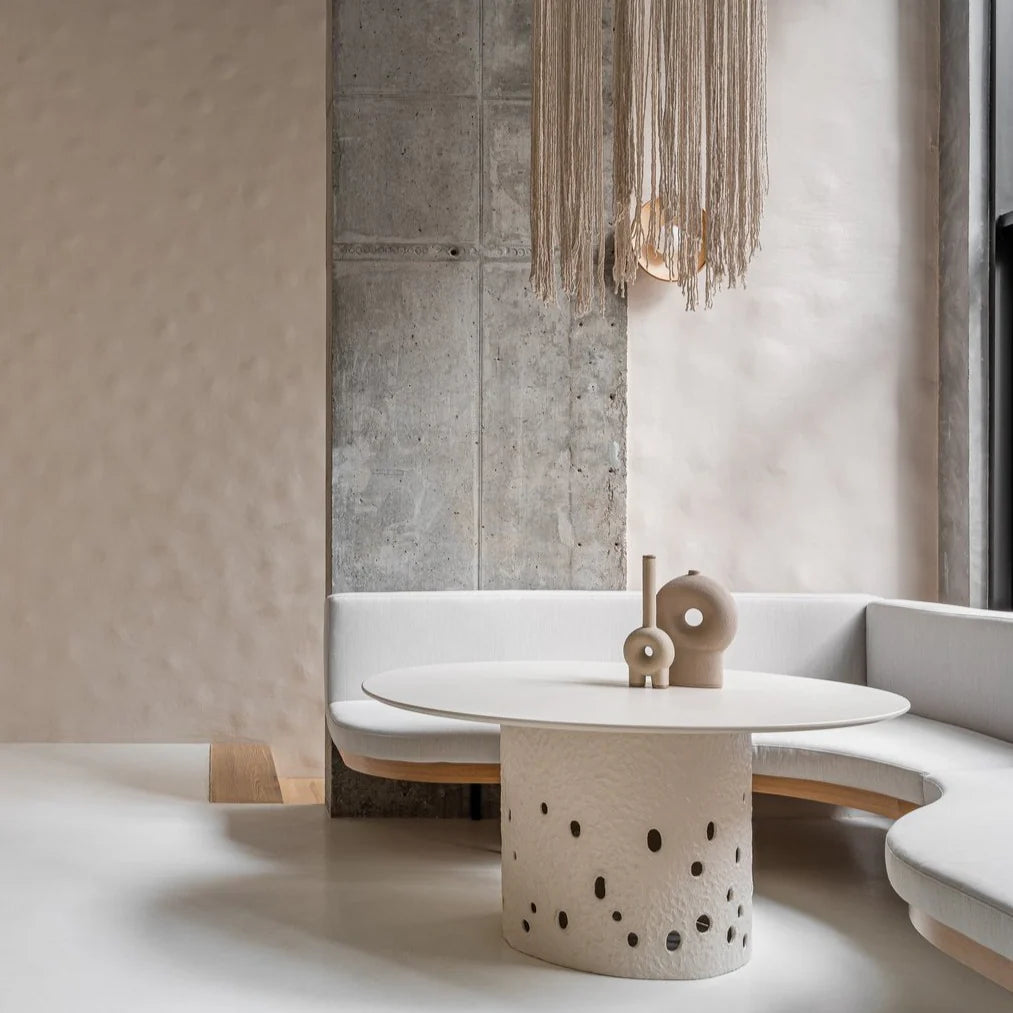 The contrast between porous textures and smooth dark red underlines the studios contemporary approach on traditional materials and craft. The connecting components between the sculptural stone elements and the aluminium parts originate from an intensive research of linking unique handmade shapes with industrial parts.