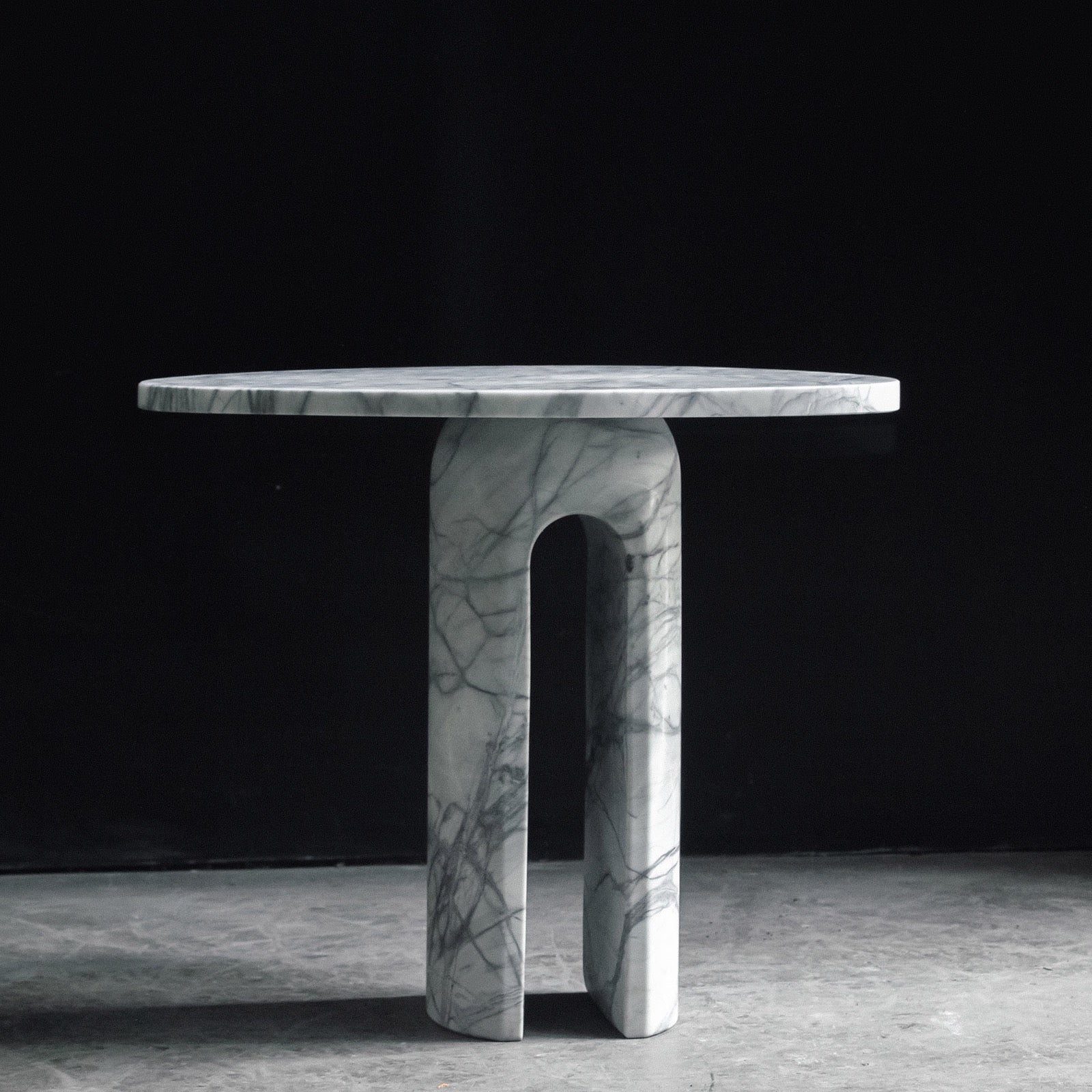 The contrast between porous textures and smooth dark red underlines the studios contemporary approach on traditional materials and craft. The connecting components between the sculptural stone elements and the aluminium parts originate from an intensive research of linking unique handmade shapes with industrial parts.