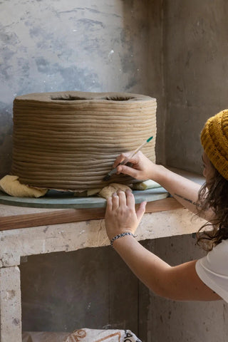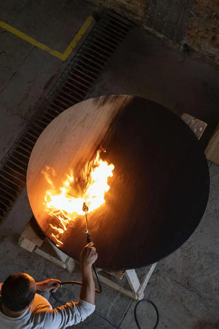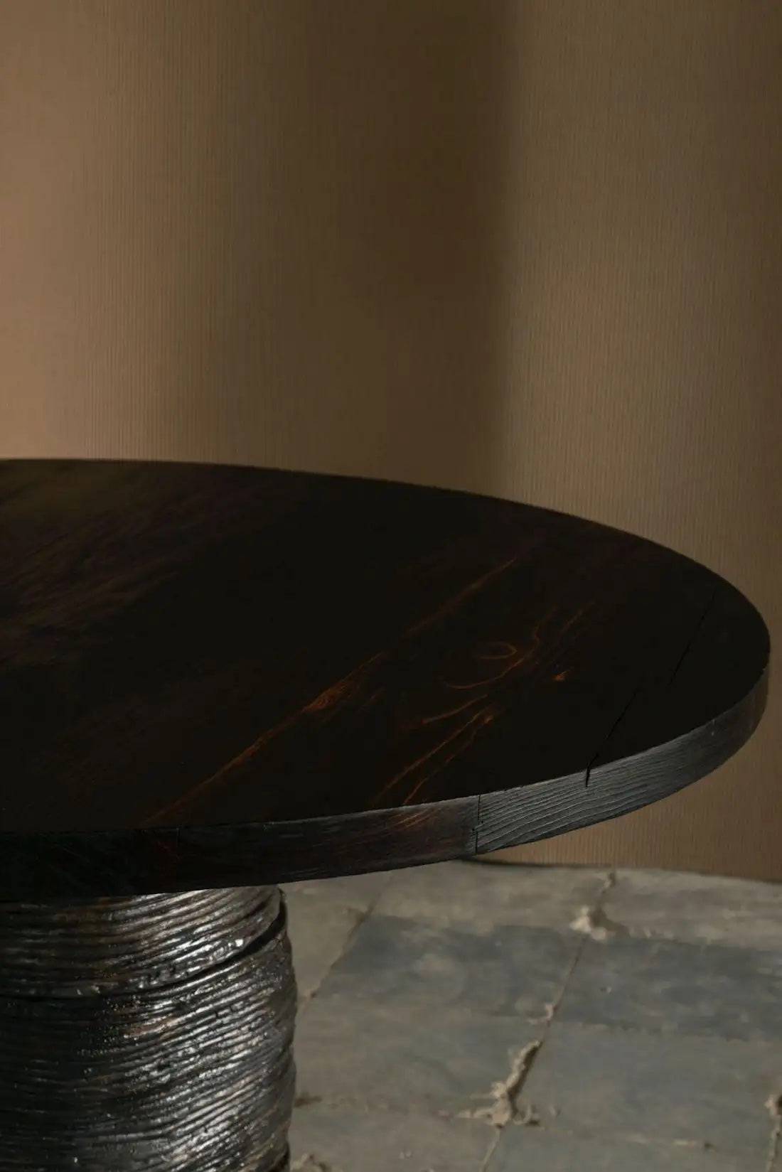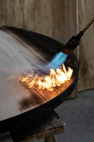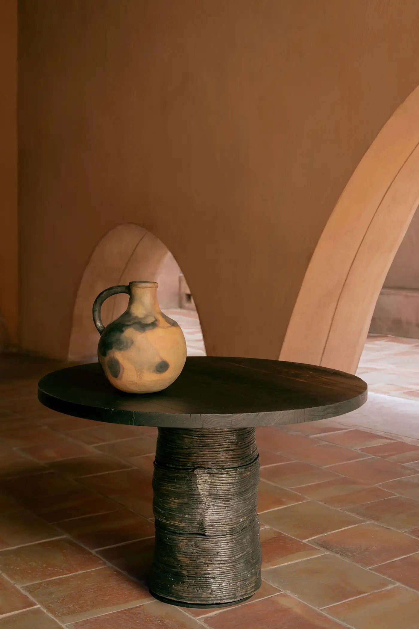 The table’s finish results from a bold and visionary desire to bring out simple shapes and natural textures. Wood charring highlights the unique character of woodgrain. The shape of the table’s base, like many authentically handcrafted pieces, partially determined the process itself. The nature of the terracotta dictated how many times the coils could wrap the base and in what shape. The hands followed along. Using a thousands-years old modeling method, the clay was modeled and coiled into rings sprinkled with copper dust and baked.