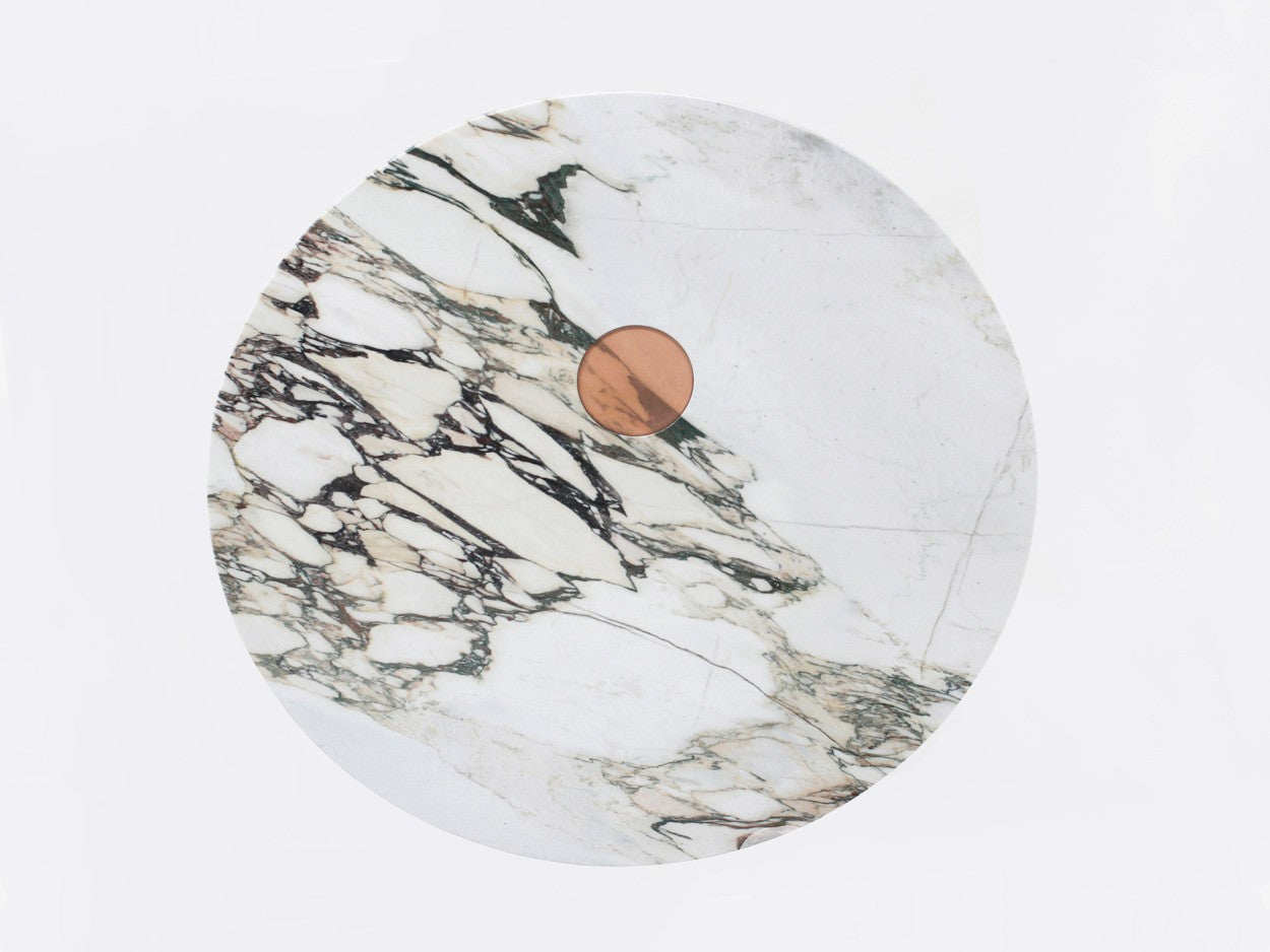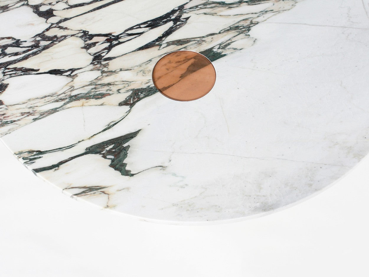 Materials: White lacquered wood base, Calacatta Paonazzo marble top, peach glass inlay