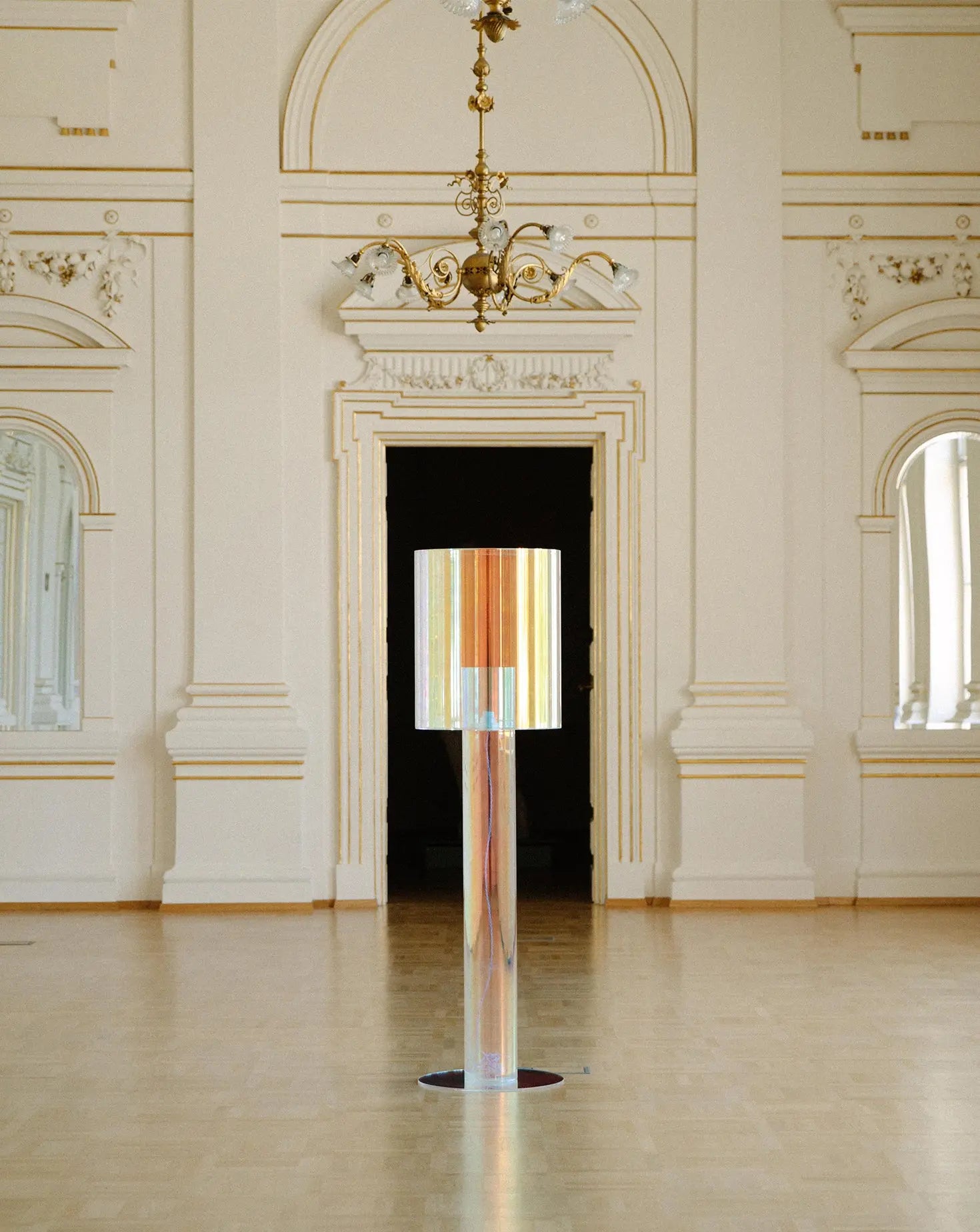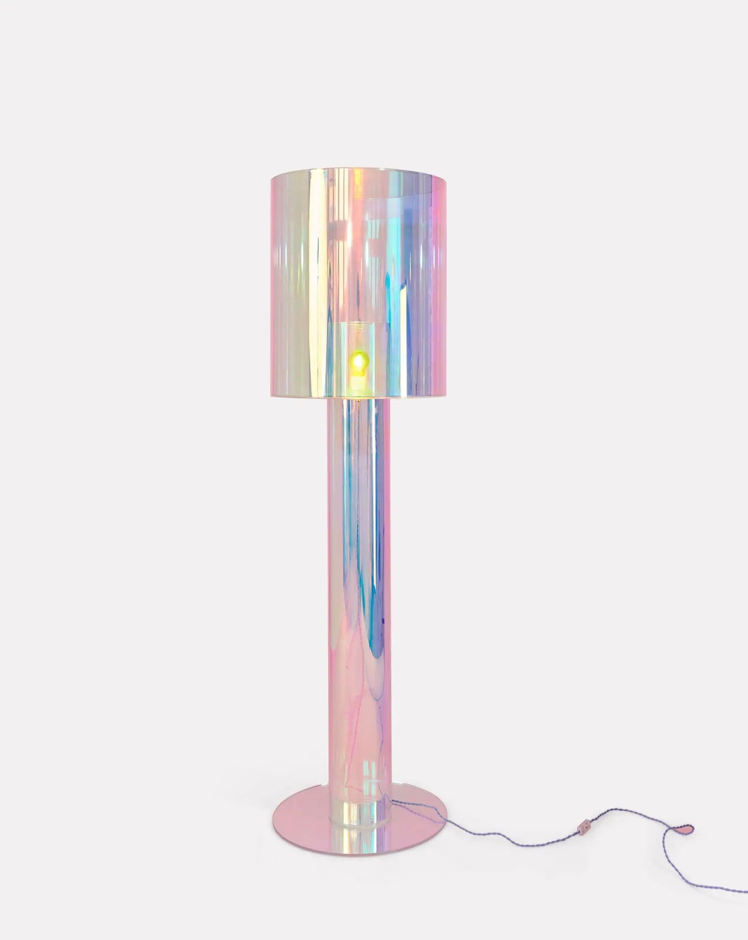 Crafted from plexiglass and adorned with hand-applied dichroic foil, it shimmers with ever-changing rainbow hues, transforming with every shift of light and perspective — like sunlit waves on a coastal skyline. Its double shade, both inner and outer, diffuses a gentle, ambient glow that softly envelops its surroundings in a warm, poetic atmosphere.