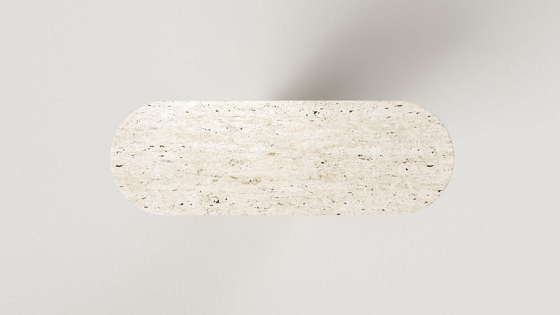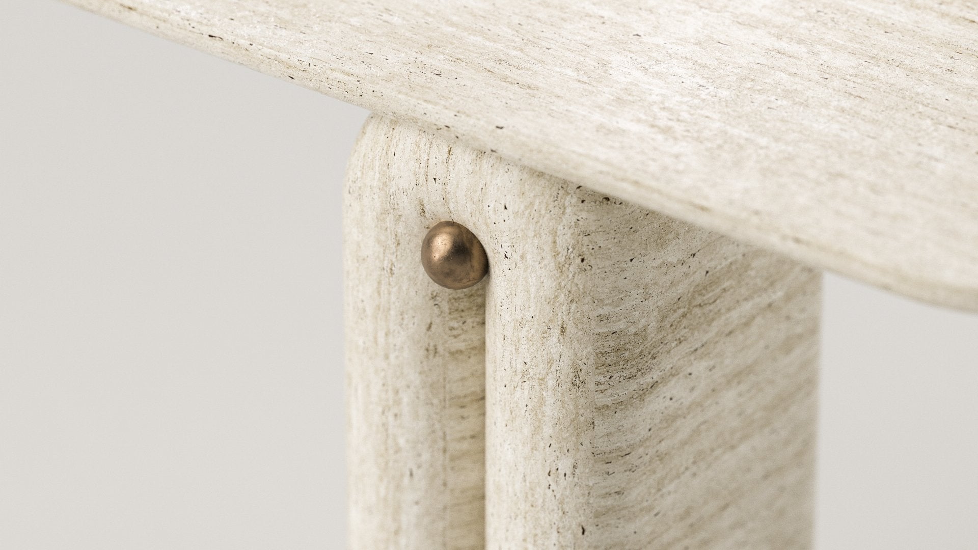 The contrast between porous textures and smooth dark red underlines the studios contemporary approach on traditional materials and craft. The connecting components between the sculptural stone elements and the aluminium parts originate from an intensive research of linking unique handmade shapes with industrial parts.