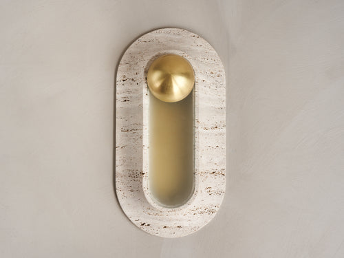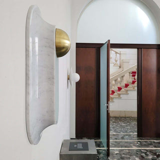 The sconce is the first lamp that its designer made in stone. It consists of a marble collar subtly emerging from the wall and a topping semi sphere made from brass from under which the light comes out.