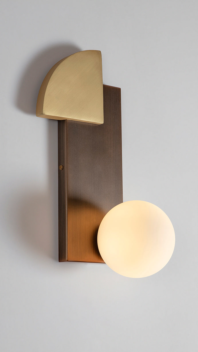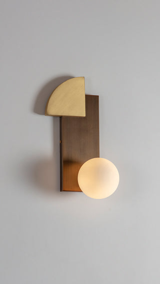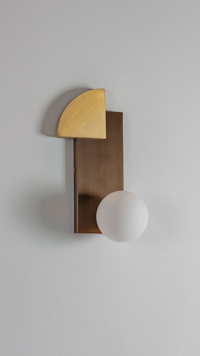 The central idea of the Square in Circle creations is the result of an alliance between contemporary design and geometric shapes. We find this logic in this wall lamp from which three geometric shapes emerge: a quadrant circle, a glass globe and a rectangle. The quadrant circle and the frosted glass globe are fixed to a rectangular back plate that completes the structure of the suspension. The lamp diffusing a halo of light, is made of medium bronze, with a brushed brass finish and opaque glass.