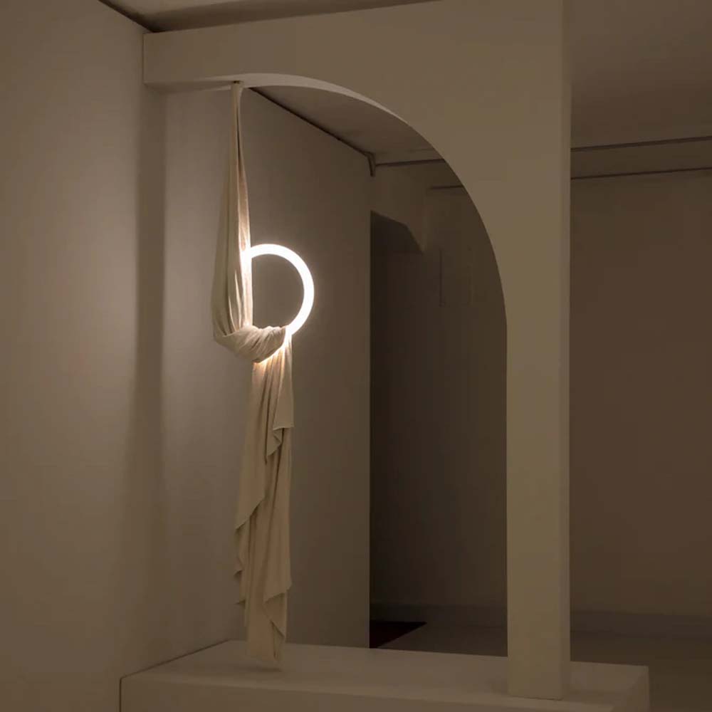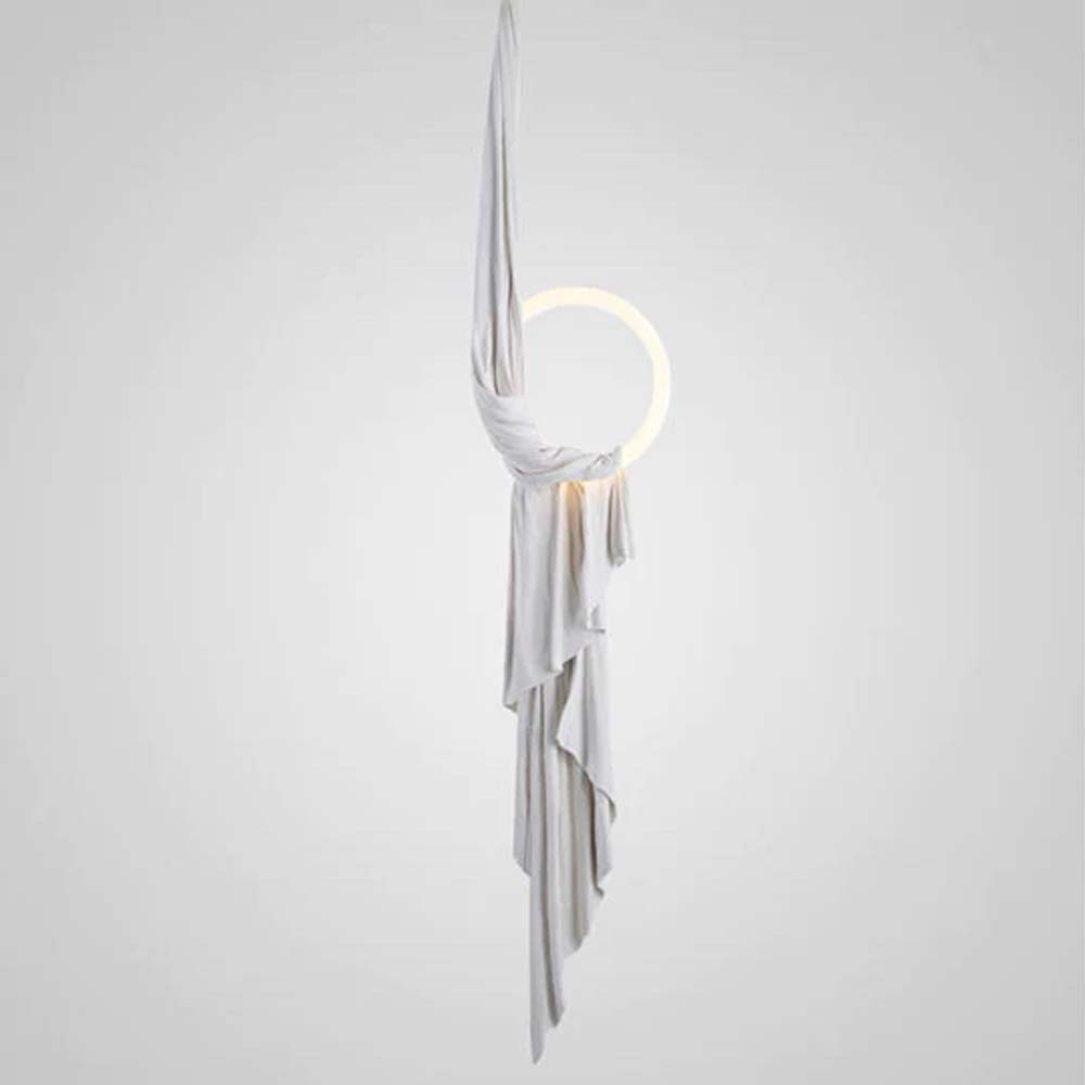 Each piece appears weightless and fluid but is solid in form, made by hand-draping fabrics in plaster through and around illuminated glass. These ghostly forms are then sculpted with more plaster into their final shape and set until solid. The effect is one of fragile drapery that appears to capture a floating light source.