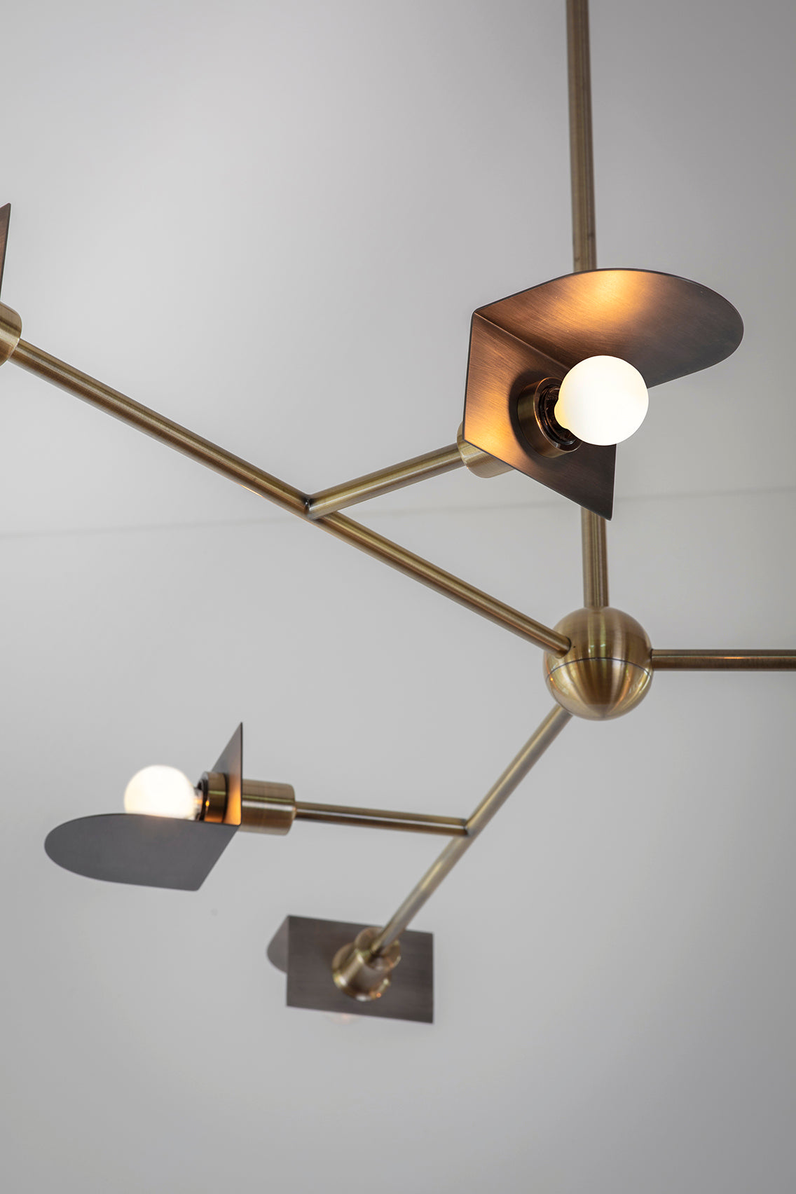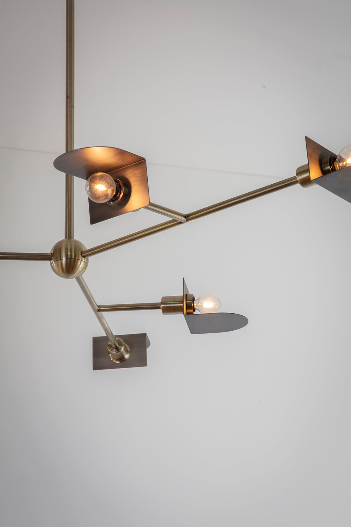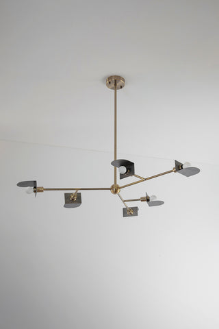 A majestic and incomparable chandelier with semi-circular multiple lighting in metal. This three-armed chandelier has six skylights representing the direction of movement. Made of two-tone metal, brushed brass and dark gray brushed metal. A pure marvel of elegance.