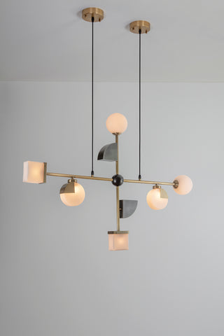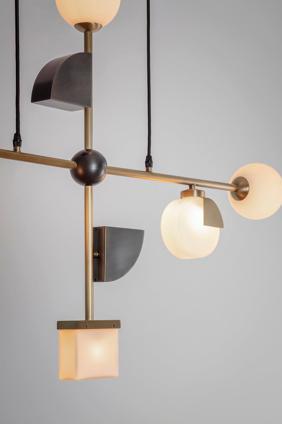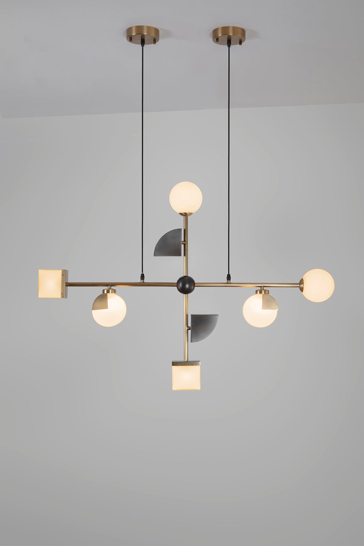 The pendant is cross-shaped and connected by an opaque black ball in the center. The lamp is suspended from adjustable black fabric cables. The lamp is made of brushed brass, brushed gray metal and opaque glass.