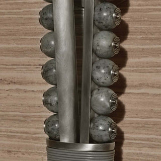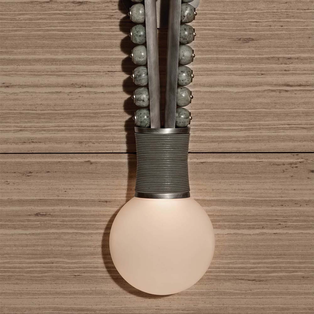The new series of light sculptures named Ambra combines volumes of ancient stones and aluminium. Centerpiece is the Mexican “Toba volcánica” stone that consists of minerals, glass and volcanic debris ejected one million years ago during severe eruptions. Fragments in the geometrical surfaces are testament to these explosions and movement.