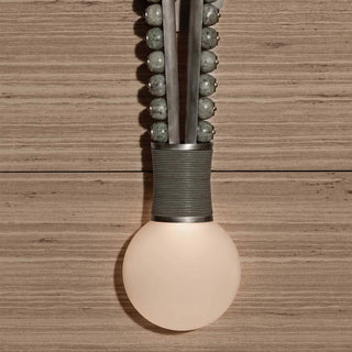 Semi-precious stone beads (agate, desert jasper, jade, or white jade), each drilled and attached to a fluted post, then threaded onto the looped structure.