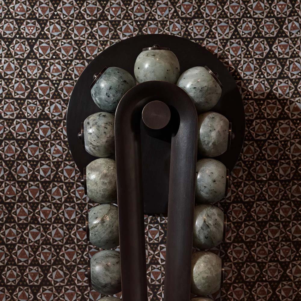 The sconce is inspired by the reliefs and statues of Persepolis in ancient Iran, as well as traditional Moroccan jewelry—a poetic fusion of ancient architecture and handcrafted ornamentation.