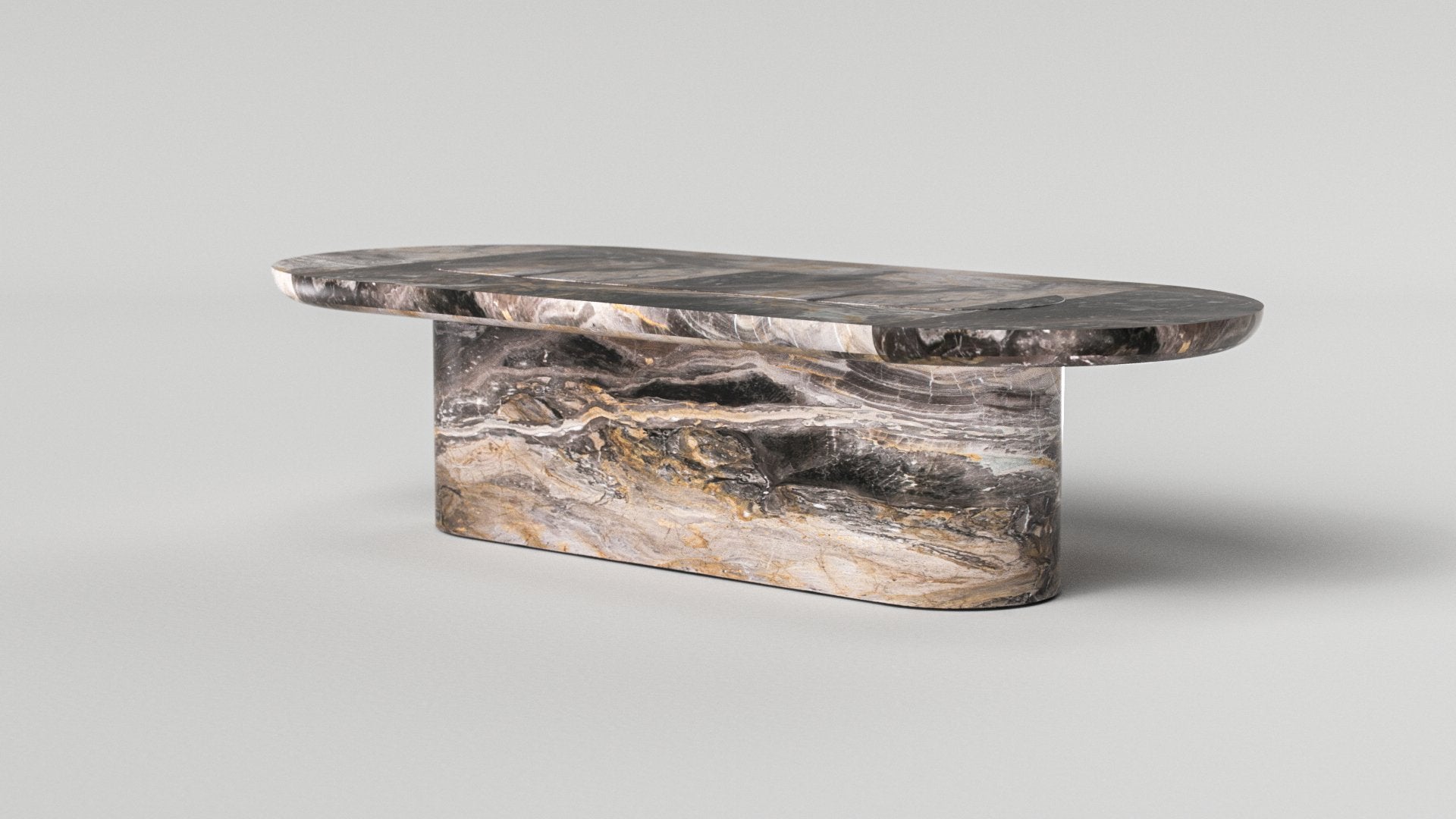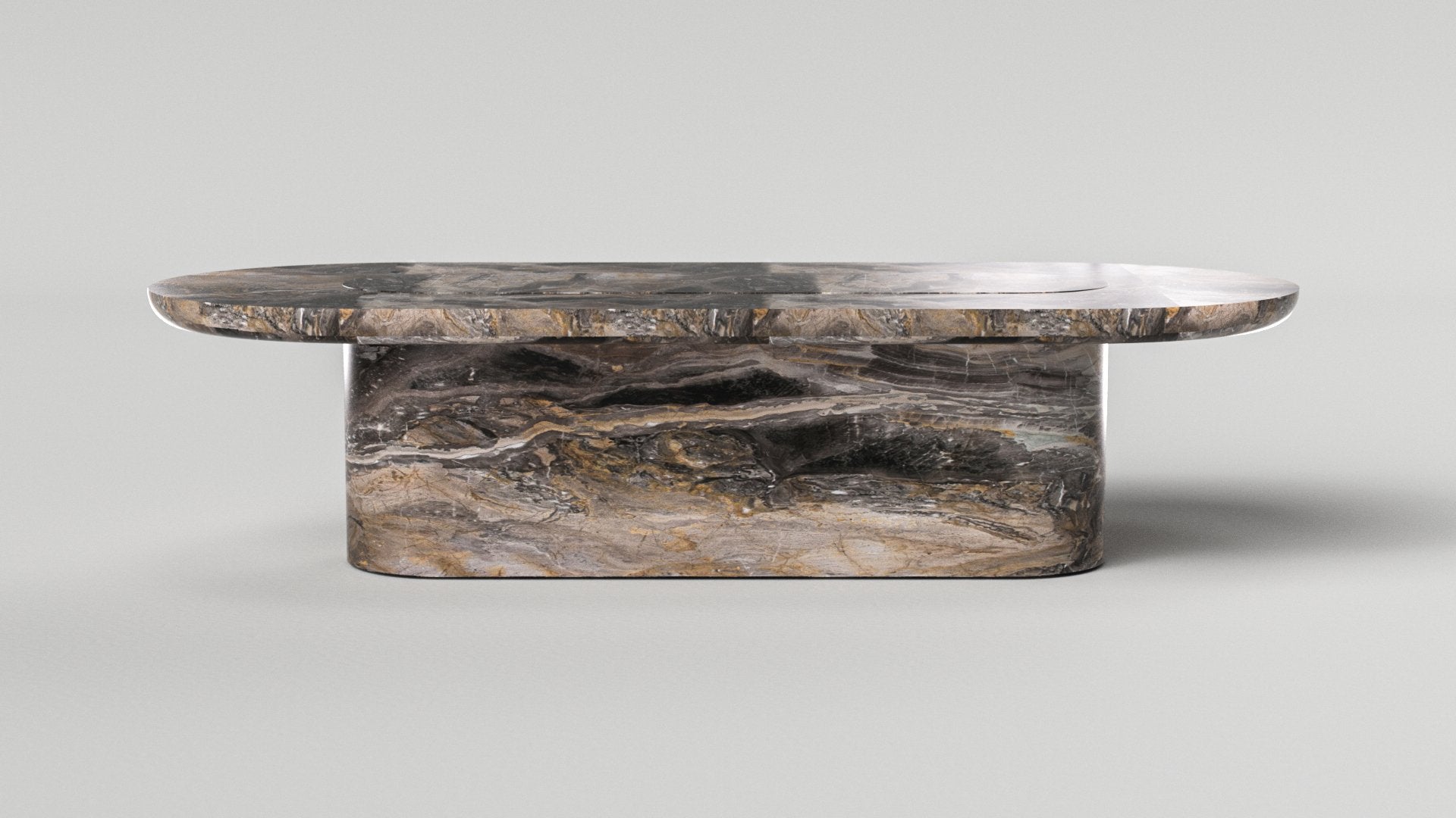 The coffee table made of the precious Arabescato Griggio marble shaped by the French designer Arthur Vallin, invites us to contemplation.